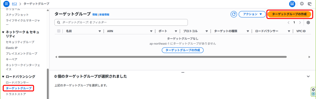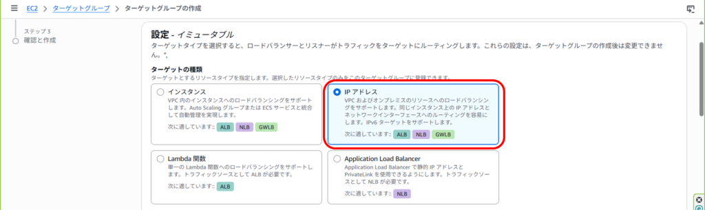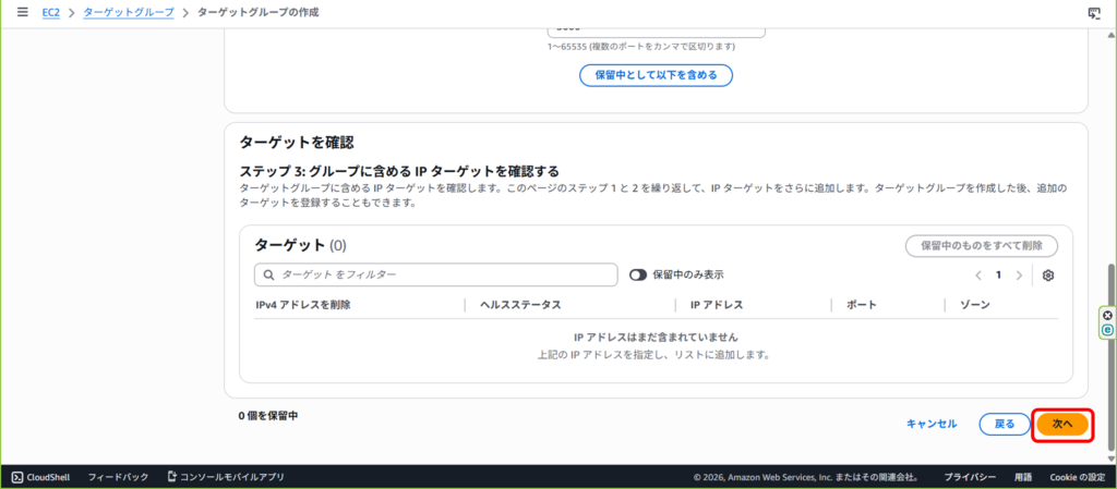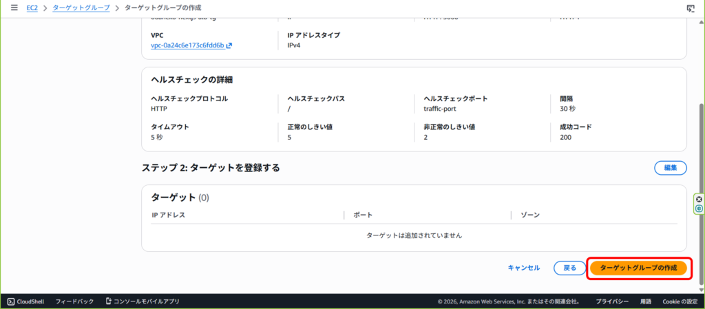 ターゲットグループはプルダウンから先ほど作成したものを選択。