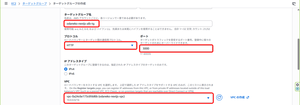 プロトコルはHTTP、ポートはNext.jsの3000番ポートを設定。