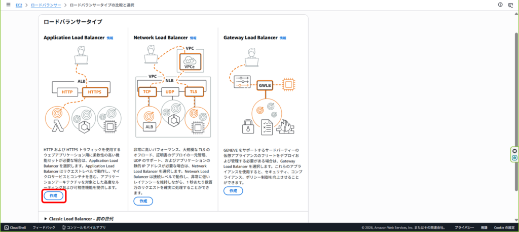 ロードバランサーの種類はApplication Load Balancerを選択。