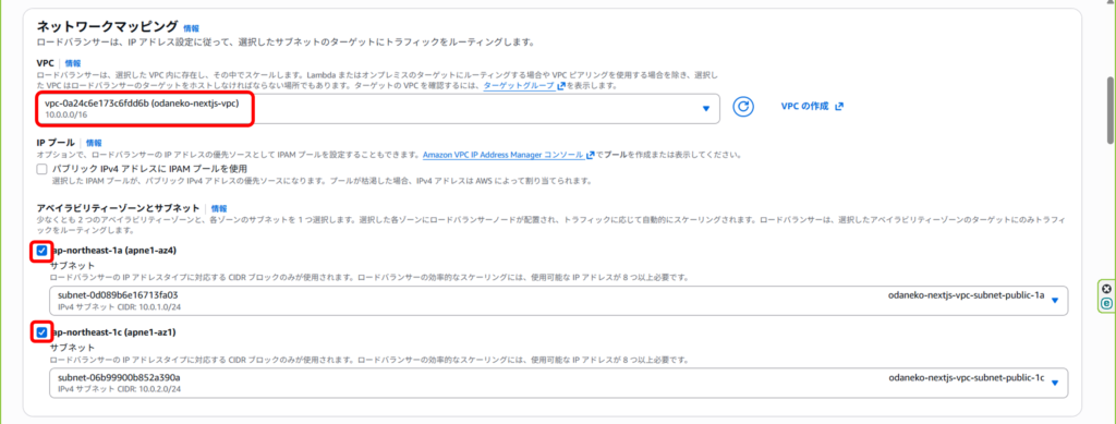 サブネットは2つにチェックを入れて、VPC作成時に作成したサブネットをプルダウンから選択。