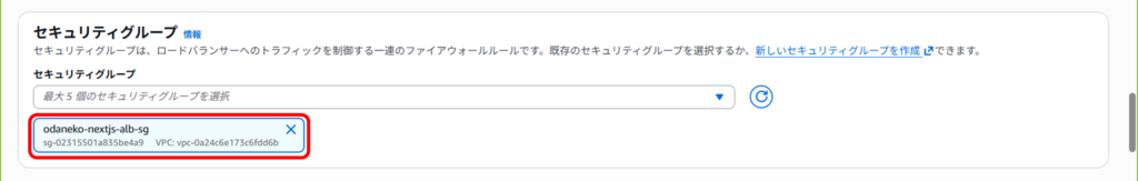 セキュリティグループは下記で作成したものをプルダウンから選択。