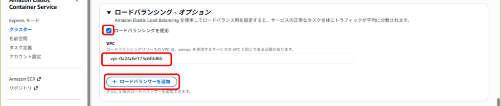 ロードバランシングを使用にチェックを入れ、ロードバランサーを追加をクリック。