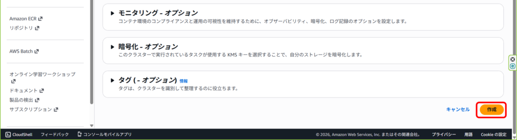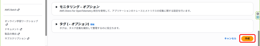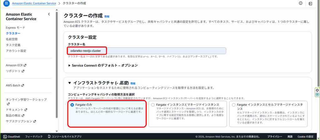 デフォルトで選択されているはずですが、インフラストラクチャでFargateのみを選択。