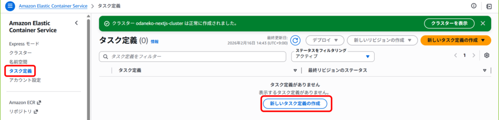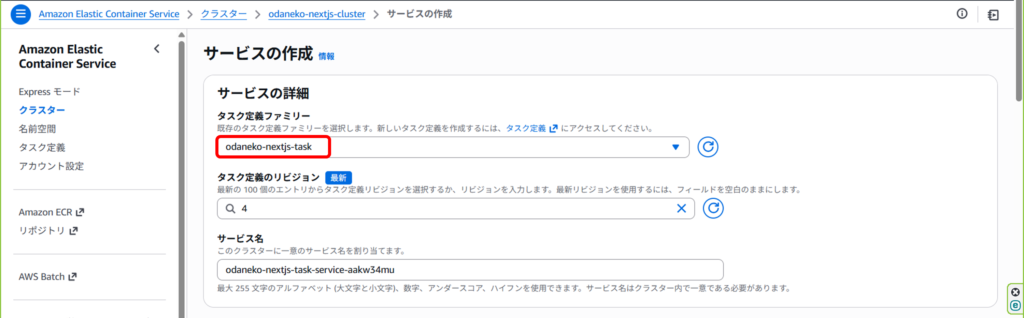 先ほど作成したタスク定義を選択。