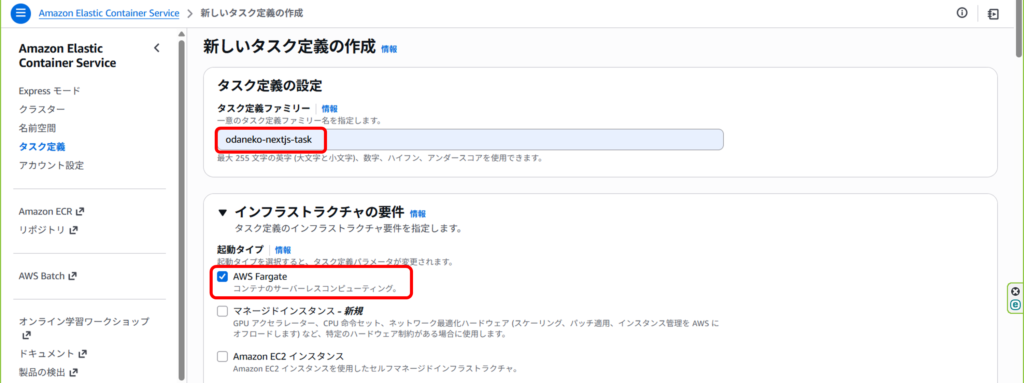 インフラストラクチャの起動タイプはAWS Fargateを選択。