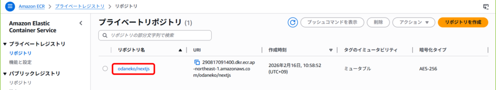 ECRから作成したリポジトリをクリック。