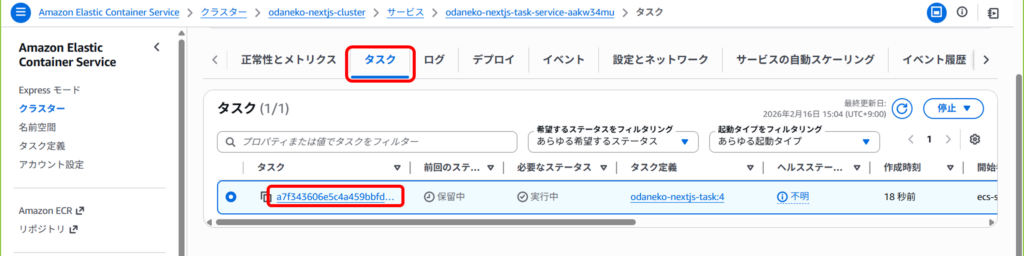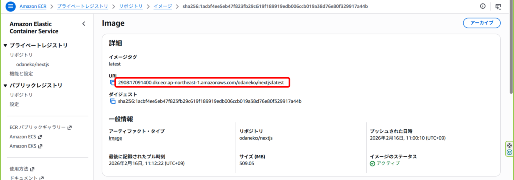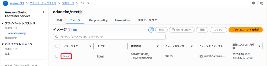 続けてECSのタスクを作成していきますが、その前に下記でECRに登録したコンテナの最新イメージのURIを取得します。