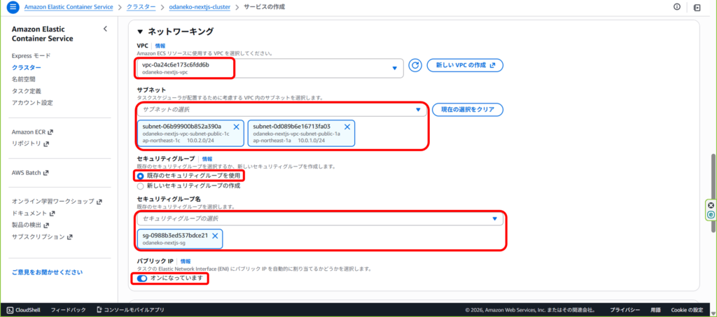 VPC、サブネットは下記で作成したものを選択。