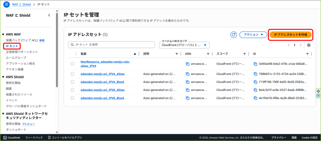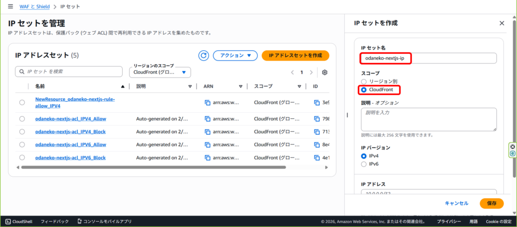 IPセット名はわかりやすいものを設定、スコープはCloudFrontを選択。