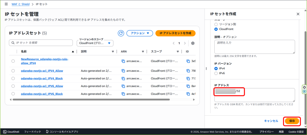 IPアドレスに先ほど確認したグローバルIPを入力し、最後に「/32」を入力して保存をクリック。