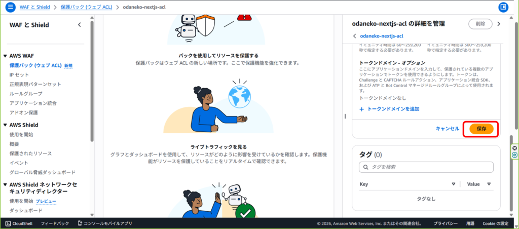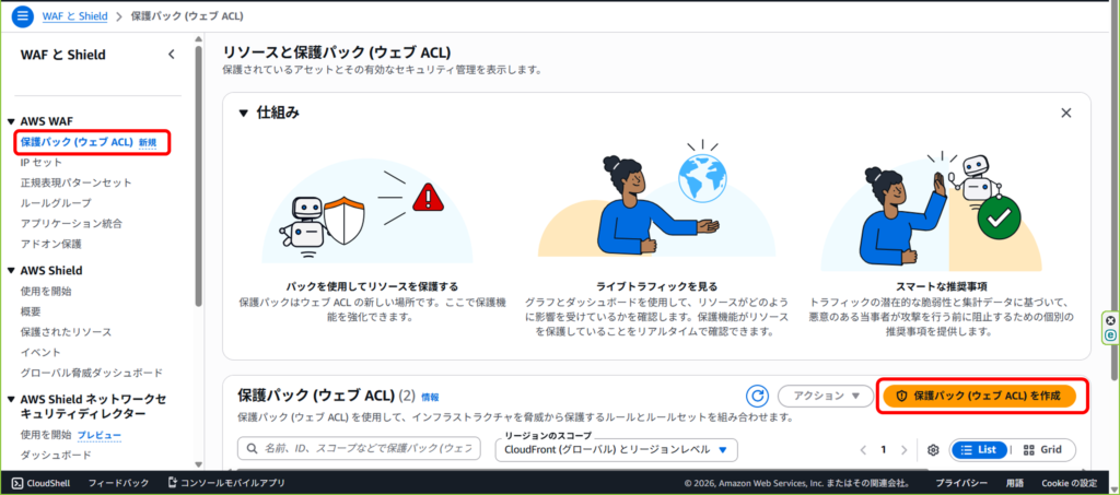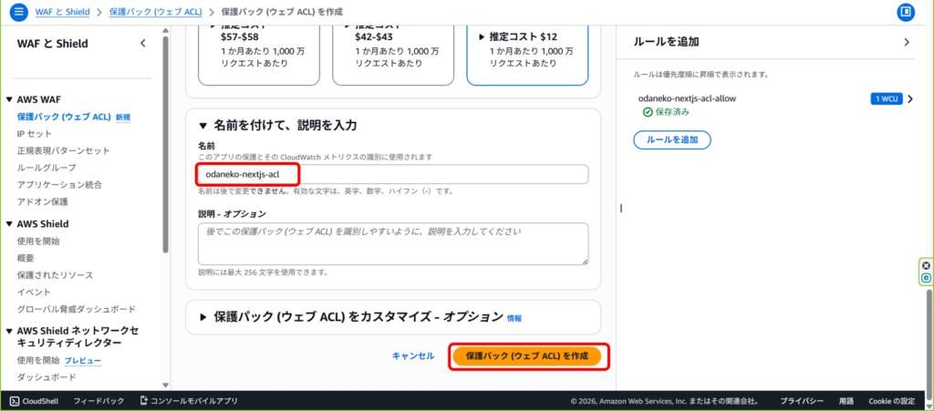 名前に分かりやすいものを入力→「保護パック(ウェブACL)を作成」をクリック。