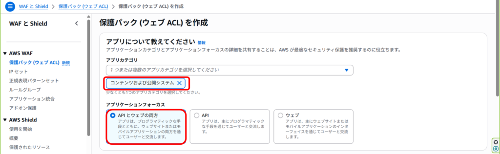 アプリケーションフォーカスはAPIとウェブの両方を選択。