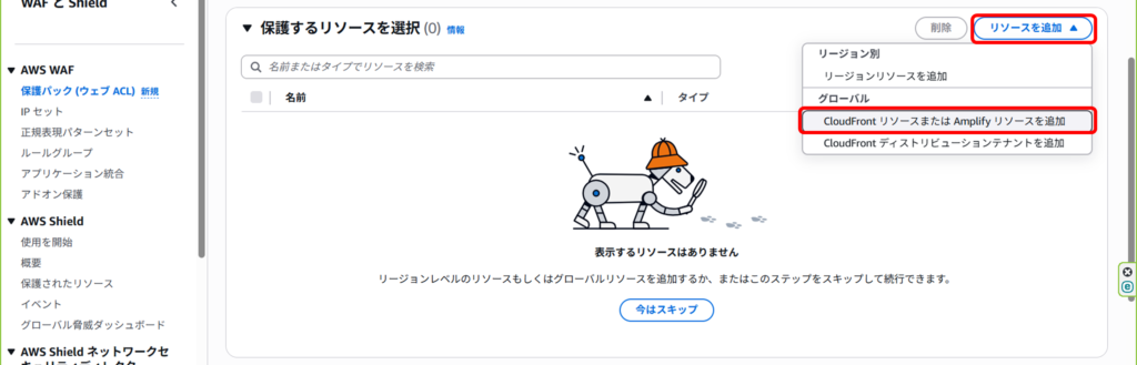 「リソースを追加」をクリック→「CloudFrontリソースまたはAmplifyリソースを追加」をクリック。