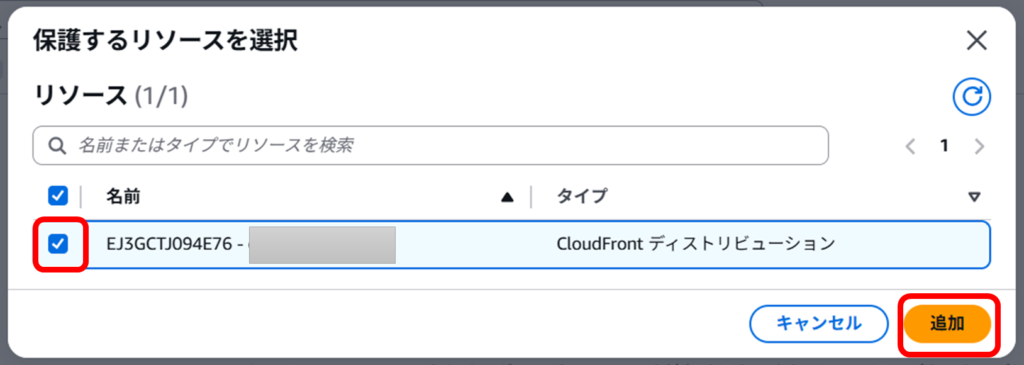 下記で作成したCloufFrontのディストリビューションを選択→「追加」をクリック。