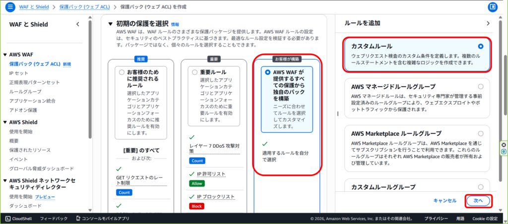 初期の保護は「お客様が構築」を選択→「カスタムルール」を選択→「次へ」をクリック。