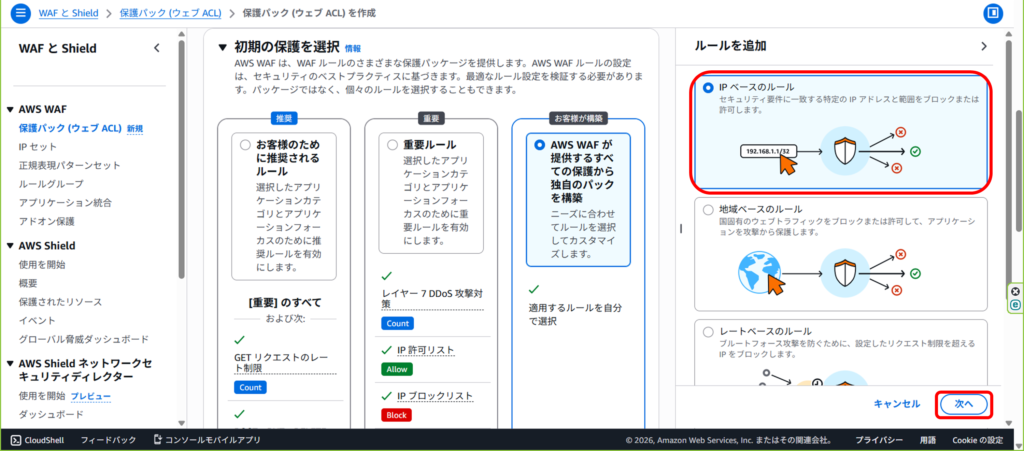 「IPベースのルール」を選択を→「次へ」をクリック。