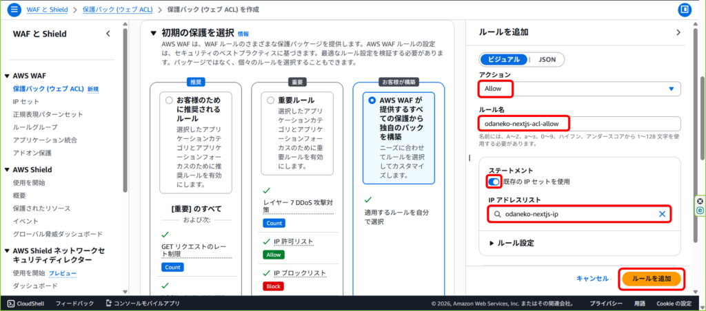 アクションはプルダウンから「Allow」を選択→ルール名はわかりやすいものを入力→「既存のIPセットを使用」をオンにする→プルダウンから先ほど作成したIPセットを選択→「ルールを追加」をクリック。
