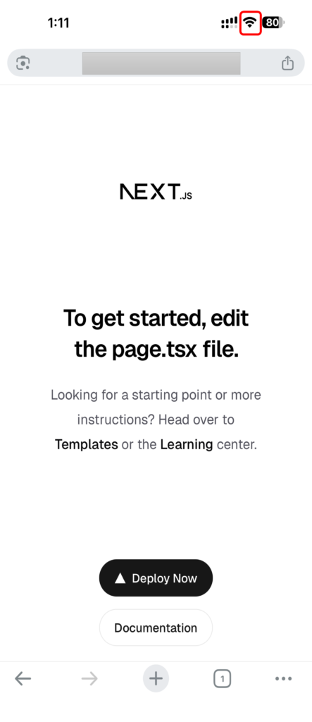 右が自宅WiFiでアクセスしたとき、許可されているためNext.jsのウェルカムページが表示。
