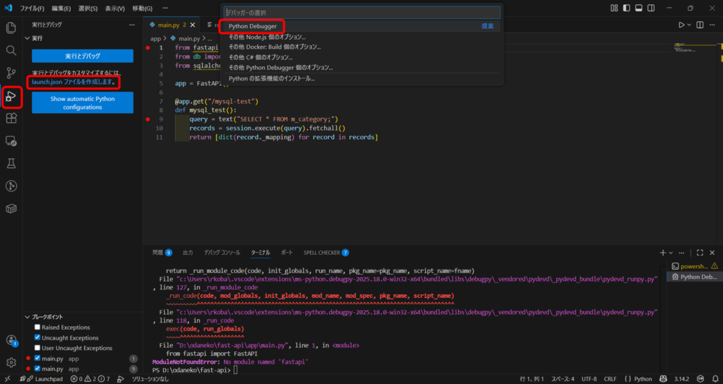 「launch.jsonファイルを作成します。」をクリック→「Python Debugger」をクリック。