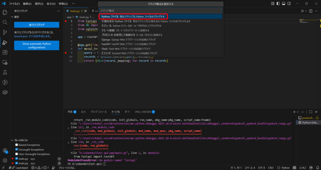 下記のQiitaの記事を参考にDocker上のFastAPIをVSCodeでデバッグしてみました。