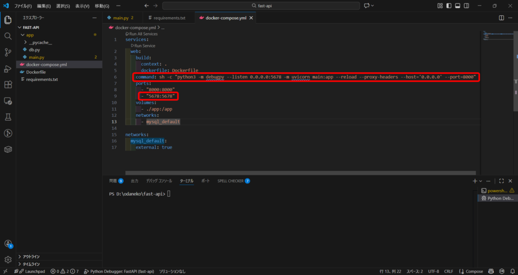 command: sh -c "python3 -m debugpy --listen 0.0.0.0:5678 -m uvicorn main:app --reload --proxy-headers --host='0.0.0.0' --port=8000"- "5678:5678"