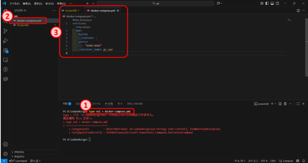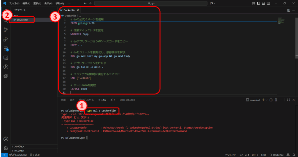 エラーメッセージが表示されますが、Dockerファイルが作成されていれば問題ありません。