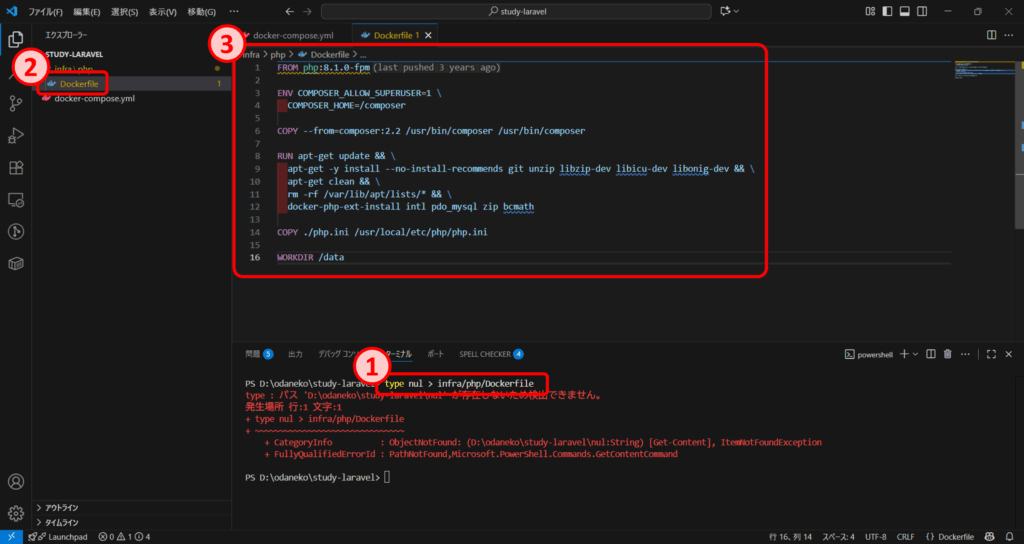 エラーメッセージが表示されますが、Dockerファイルが作成されていれば問題ありません。