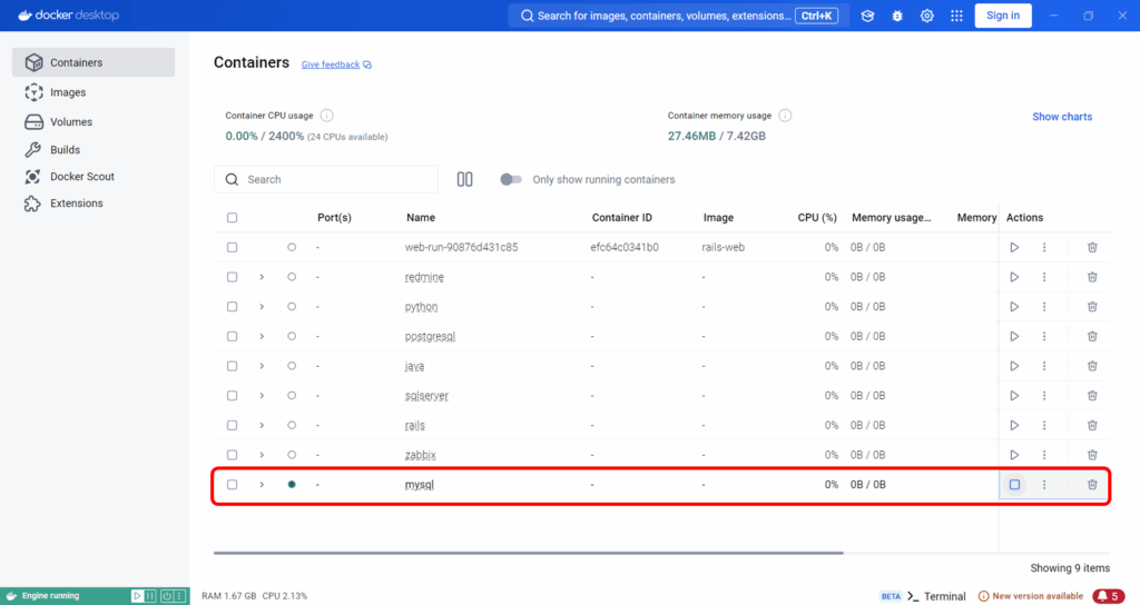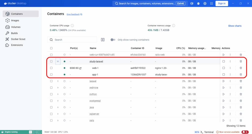 Dockerの画面で2つのコンテナが起動していればOKです。