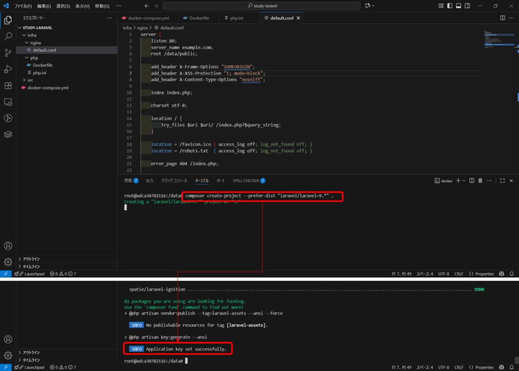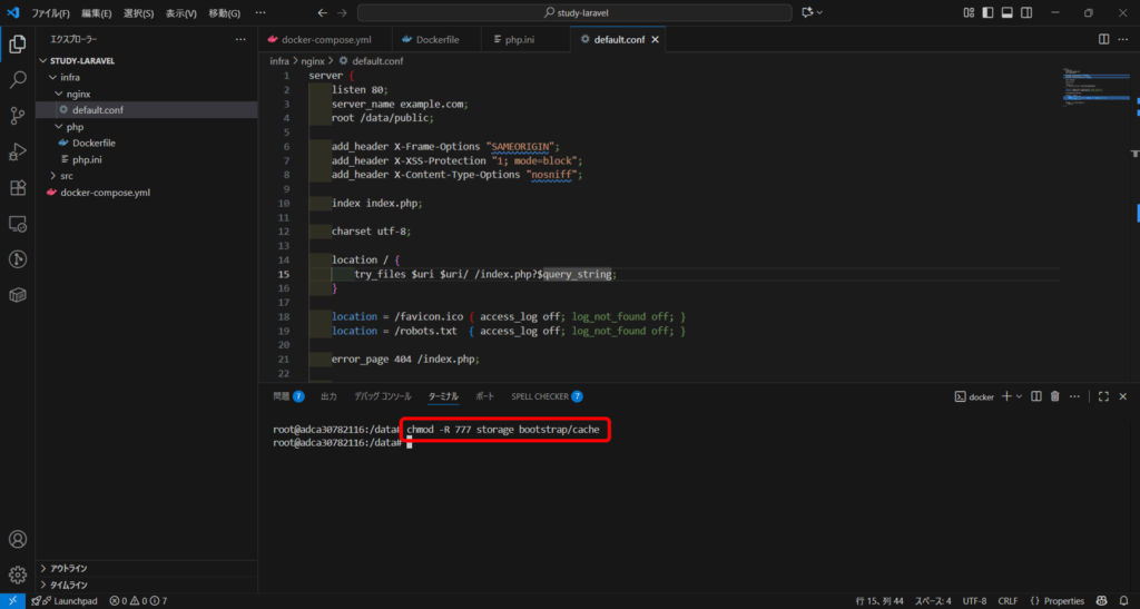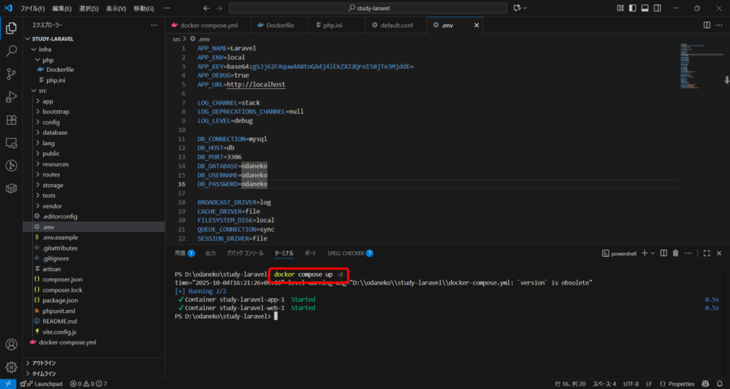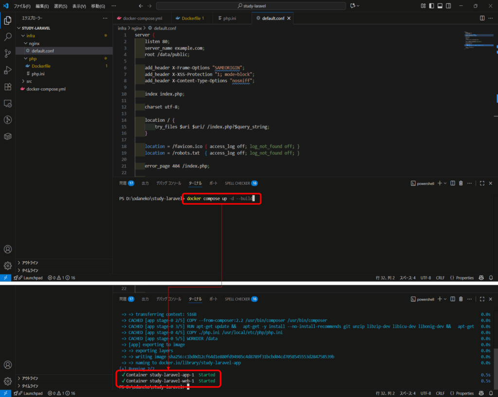 下記のコマンドを実行して、コンテナをビルド・立ち上げます。