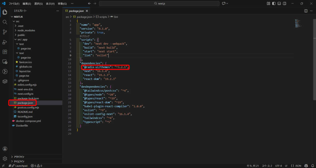 src\package.jsonを開いてradix-ui/themesの記載があればOK。