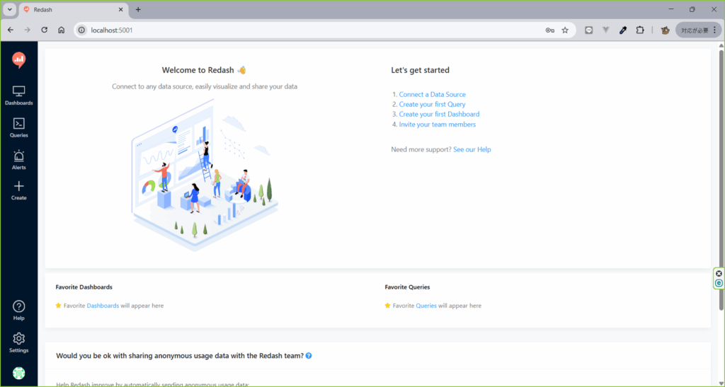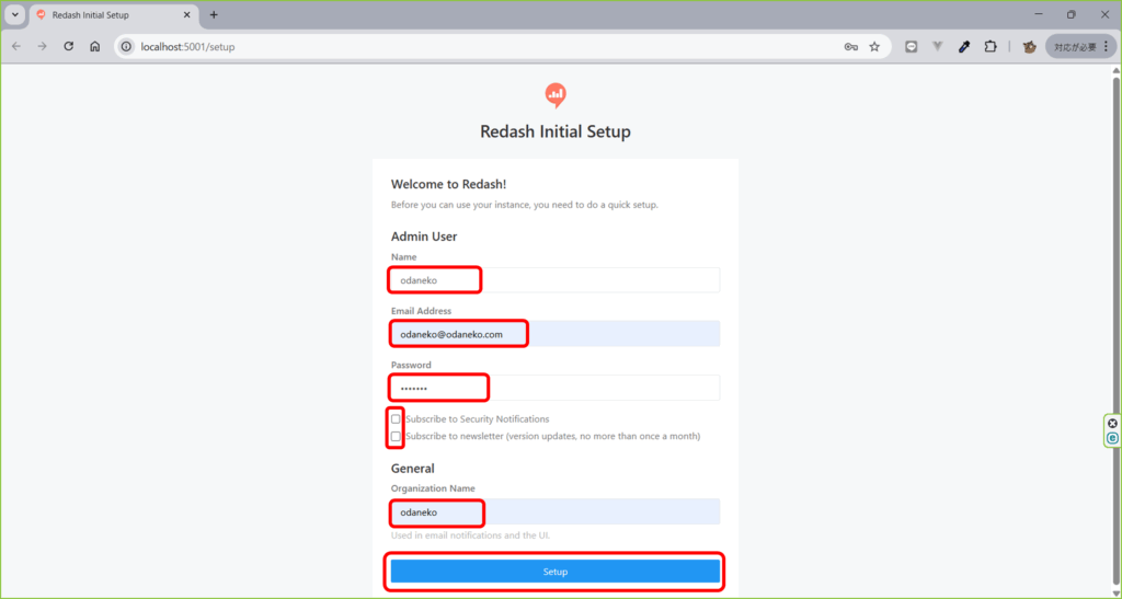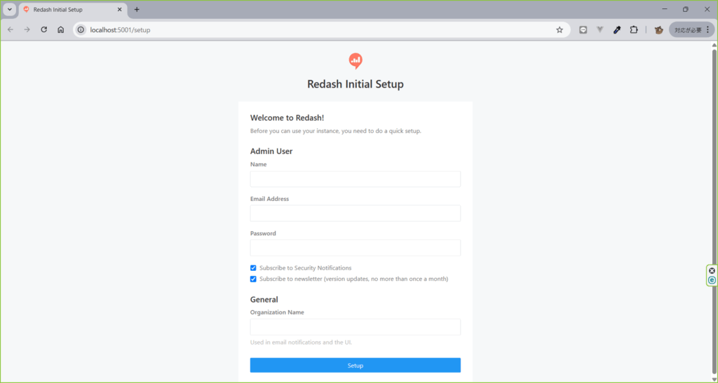Redashのセットアップ画面が表示されたら正常に環境構築ができています。