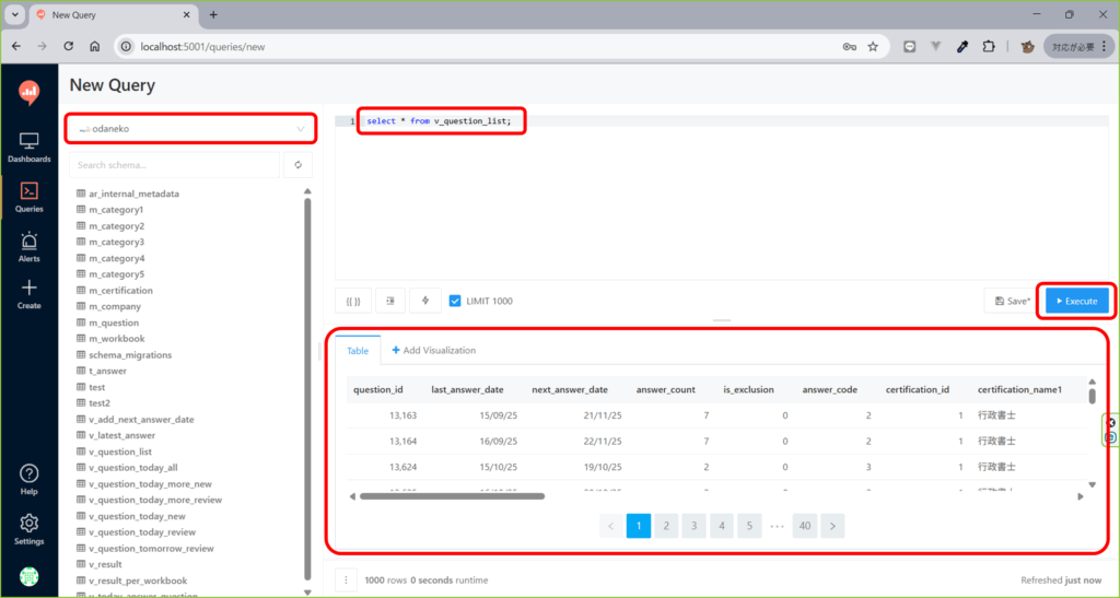 左上のプルダウンでデータベースを選択して、適当にクエリを実行してレコードが取得できていることを確認します。