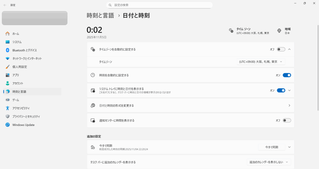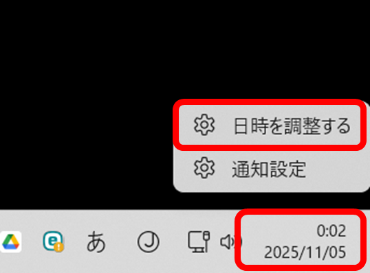 タスクバー右下にある日時を右クリック→日時を調整するをクリック