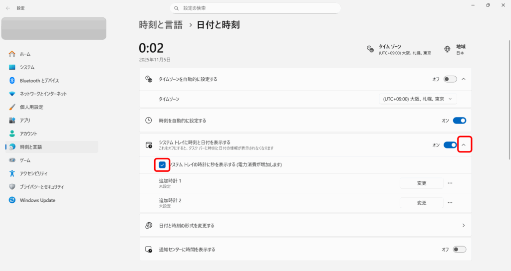 システムトレイの時計に秒を表示するにチェックを入れます。