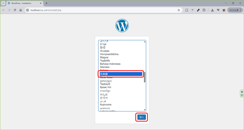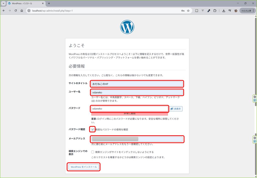 下記のもろもろを入力し、WordPressをインストールをクリックします。