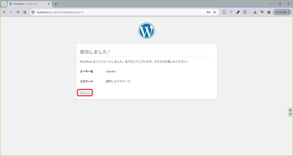WordPressのインストールが成功すると下記の画面が表示されます。