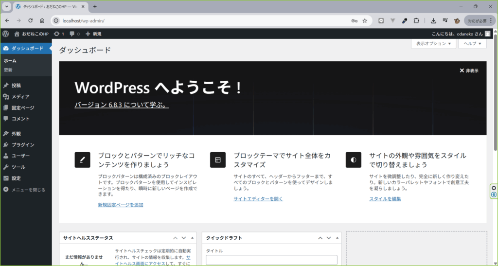 インストール時に設定したユーザーとパスワードを入力して、ログインボタンをクリックします。
