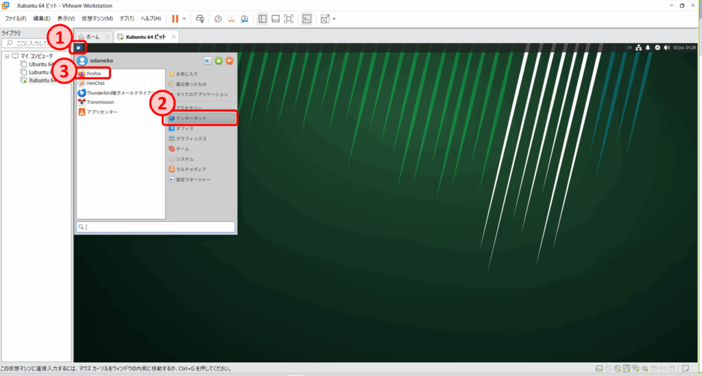 左上のスタートメニュー→インターネット→Firefoxの順にクリックします。