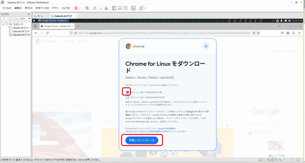 Ubuntu用を選択(デフォルトで選択されています)→同意してインストールをクリックします。