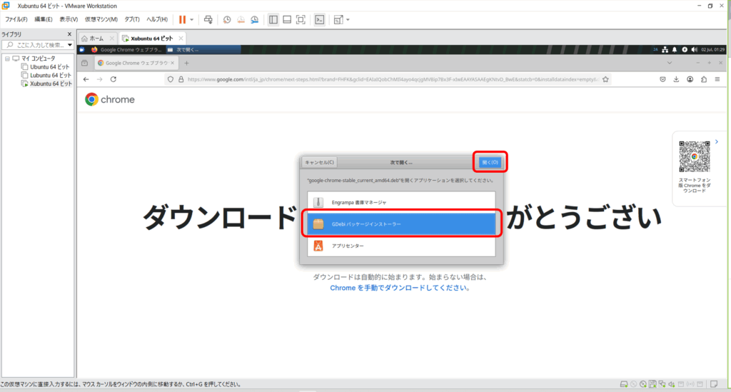 ポップアップのGDebiパッケージインストーラーを選択→開くをクリックします。