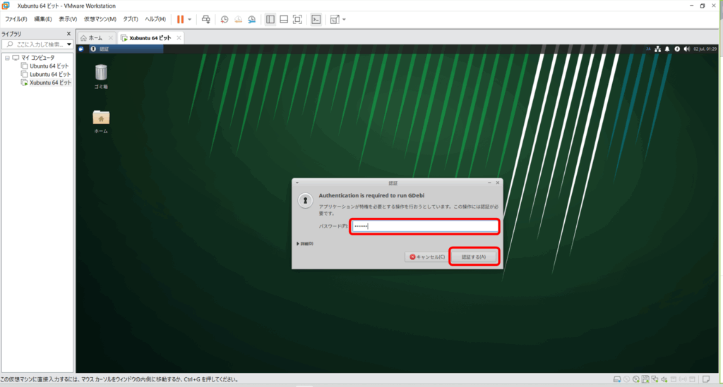 認証を要求される場合、Xubuntuにログインする際のパスワードを入力します。