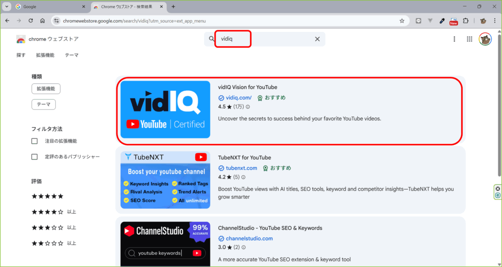 vidIQで検索し、一番上に出てくるはずなのでvidIQをクリックします。