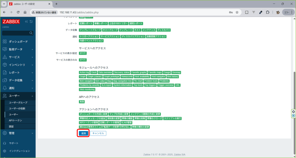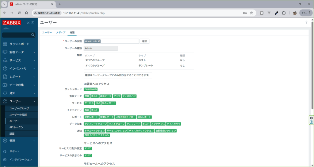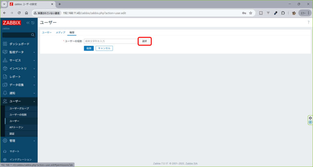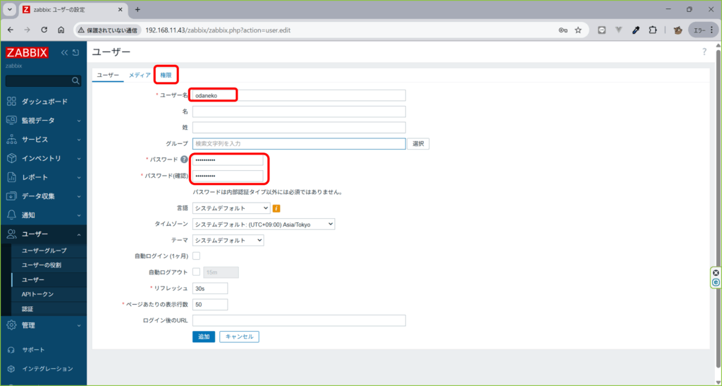ユーザー名とパスワードを入力後、権限タブをクリックします。