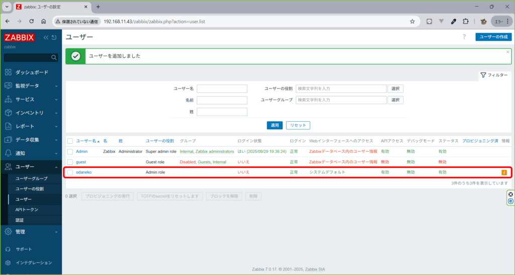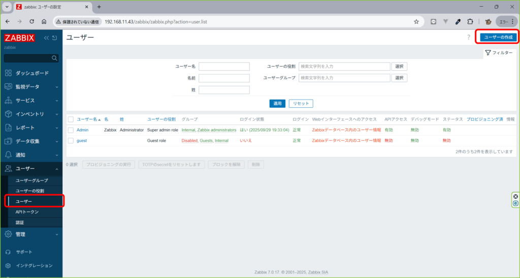 左側のメニューからユーザーをクリック→遷移したページの右上のユーザーの作成をクリックします。
