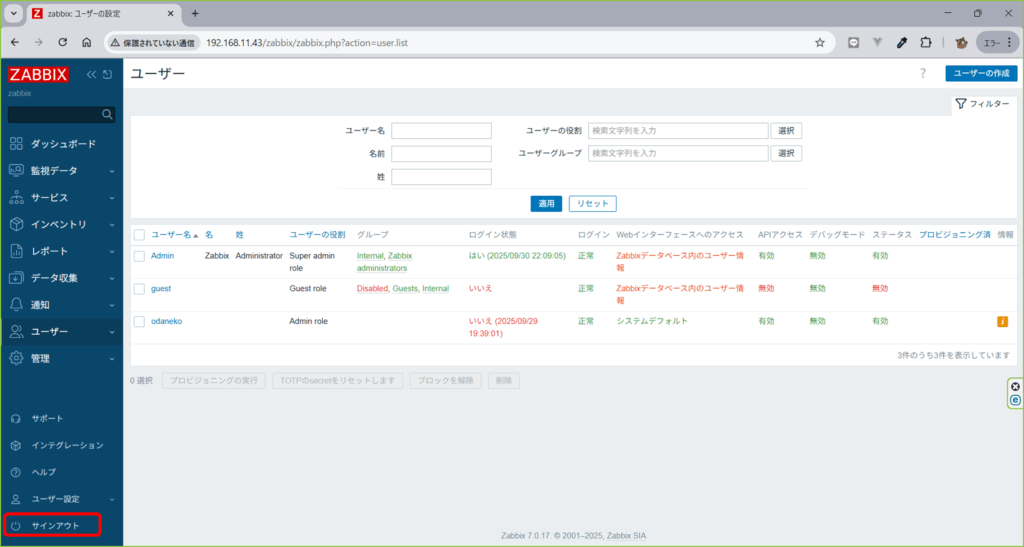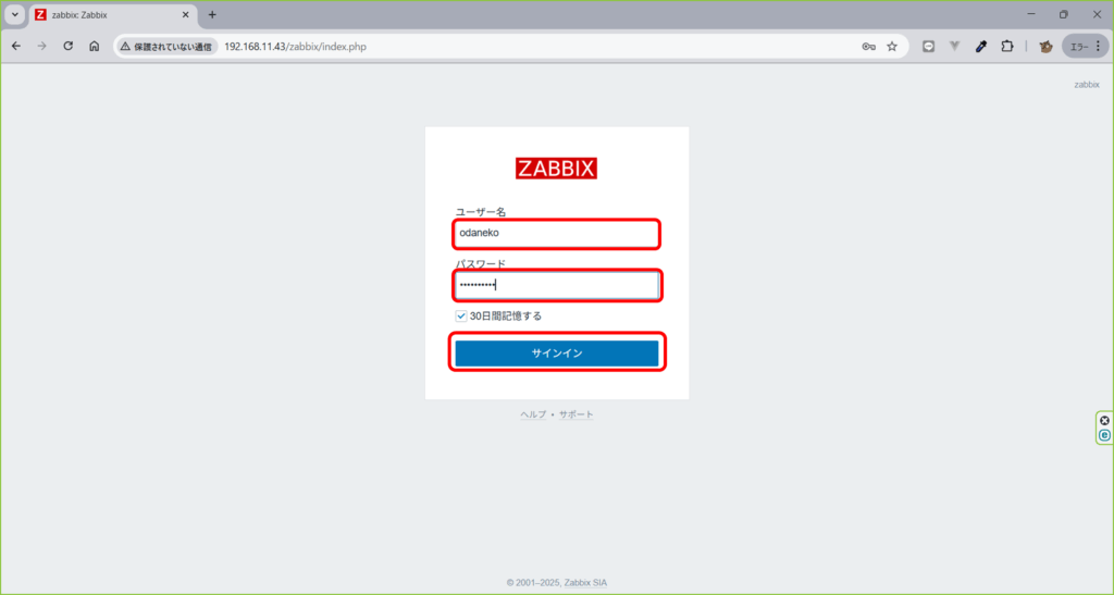 先ほど作成したユーザー名とパスワードを入力して、サインインをクリックします。